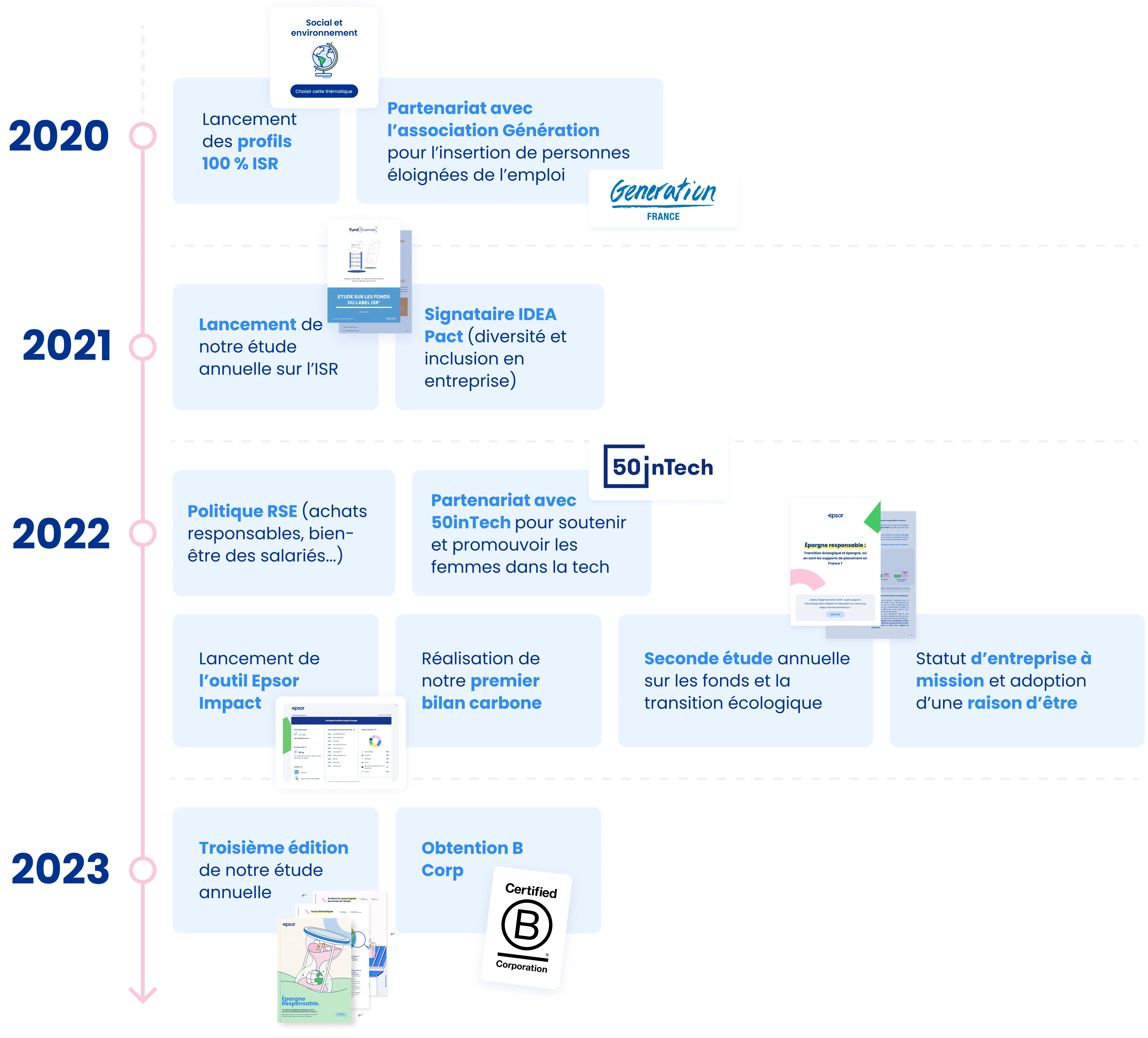 Quelques années après avoir posé les bases de cette nouvelle offre d’épargne salariale et retraite, Epsor a formalisé ses engagements du quotidien en adoptant le statut d’entreprise à mission et en se dotant d’une raison d’être : “guider et éclairer les épargnants d’aujourd’hui dans l’intérêt de demain”.