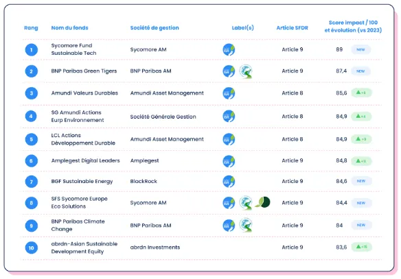 Les fonds Article 9 SFDR et/ou labellisés ISR continuent de se distinguer comme les meilleurs fonds pour engager son épargne de manière responsable. La réforme a rapproché les fonds ISR des fonds Article 9 SFDR, tant en matière d’impact que de financement de la transition écologique. Ces fonds se démarquent par leur capacité à financer des projets alignés avec les objectifs climatiques et à générer un impact positif sur l’environnement et la société.
