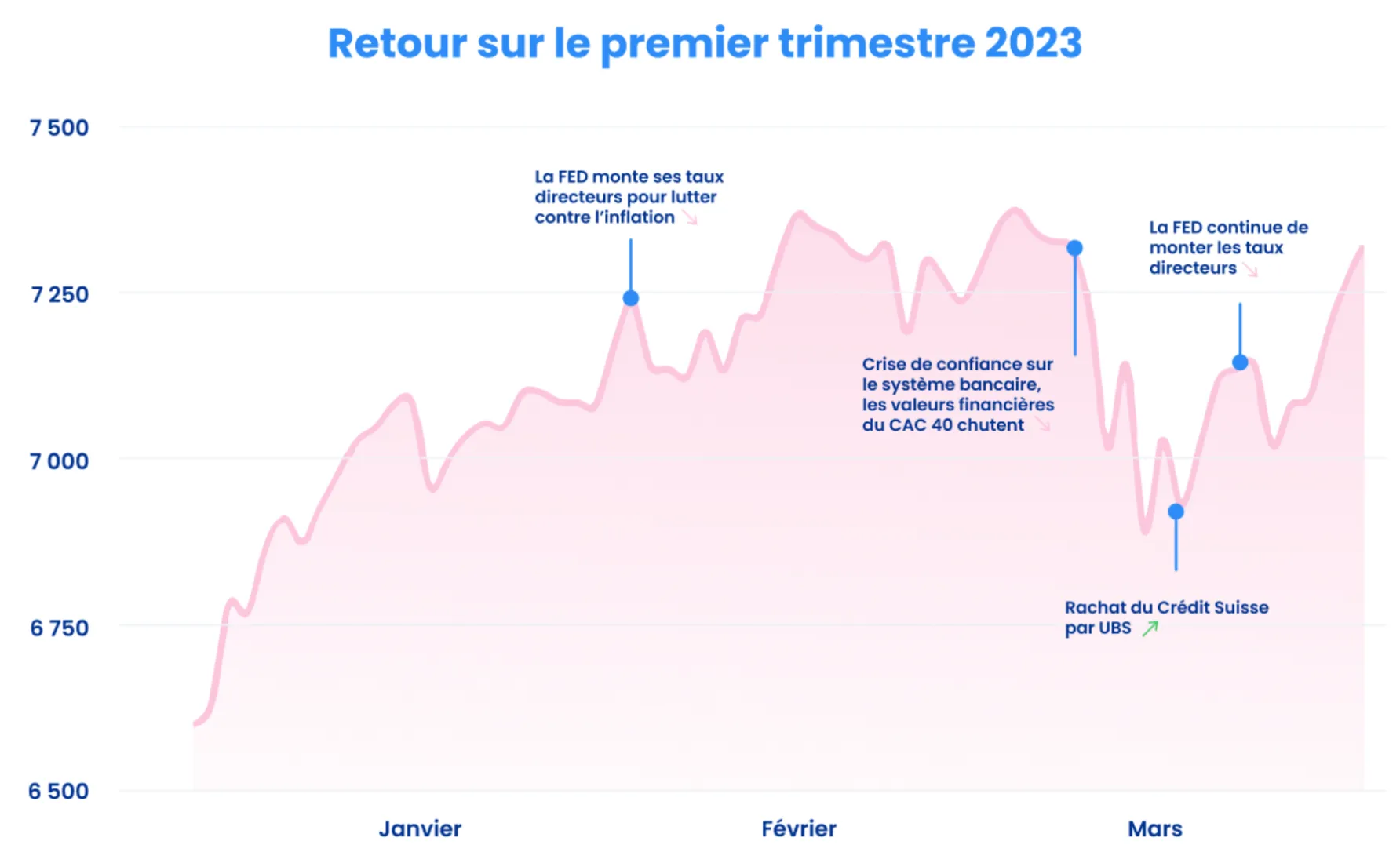 Le mois de février a été marqué par la hausse des taux directeurs par les Banques Centrales (Fed et BCE) expliquant la baisse des marchés financiers. Au mois de mars, le secteur financier a été touché par la faillite de plusieurs banques.