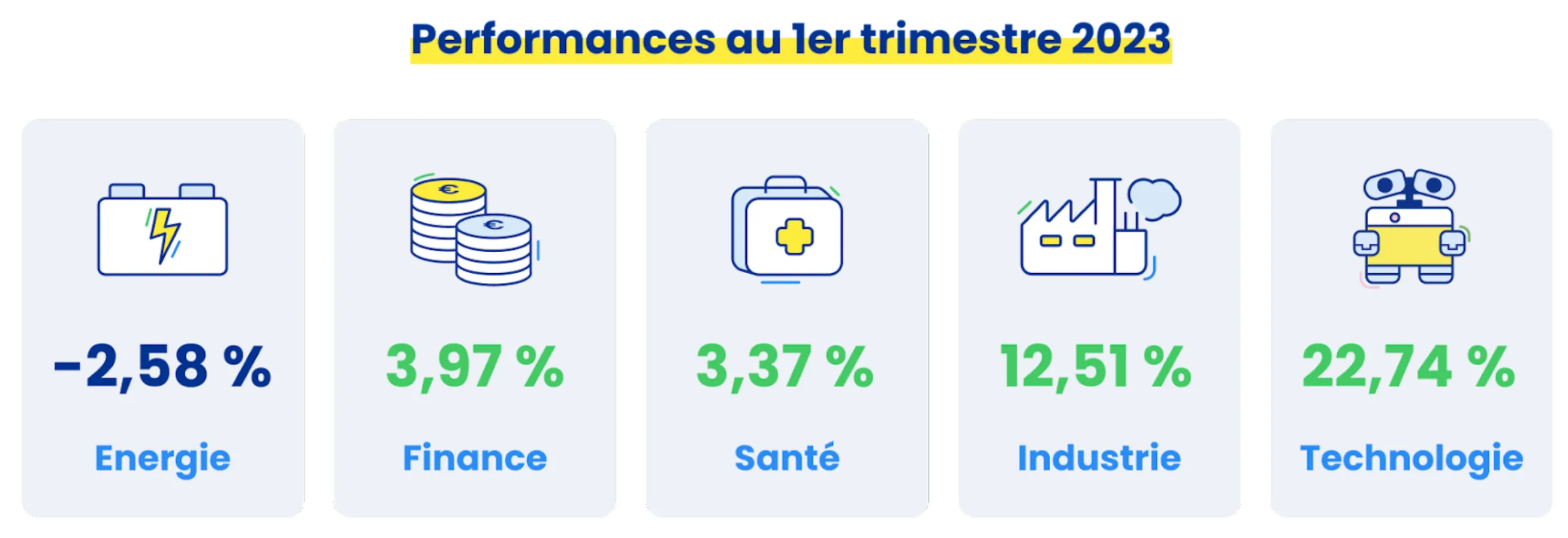 Le secteur financier termine le premier trimestre avec une performance positive. Ce résultat a été tout de même impacté par les différentes faillites bancaires : au mois de mars il a enregistré une chute de 8 %. Il avait pourtant tiré son épingle du jeu en début d'année.