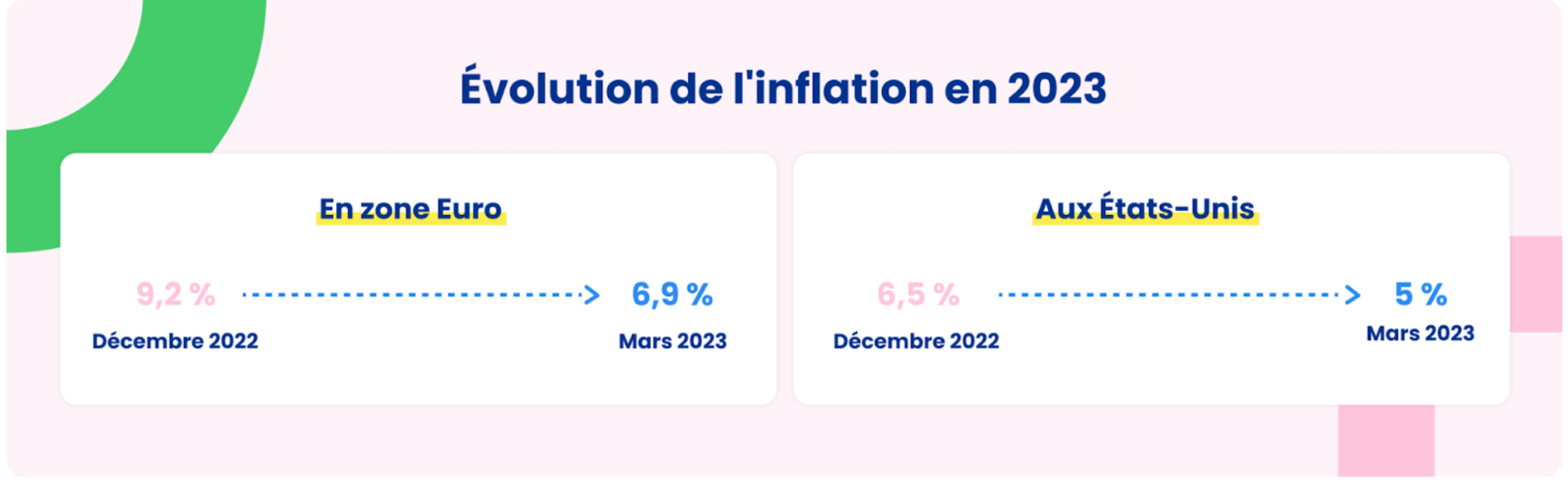 Afin de contrer l’inflation, les banques centrales ont augmenté les taux directeurs pour atteindre en mars 3 % en Europe et 5 % aux États-Unis. La BCE (banque centrale européenne) et la Fed (banque centrale des États-Unis) ont estimé que les taux pourraient à nouveau augmenter si l’inflation ne diminuait pas davantage.